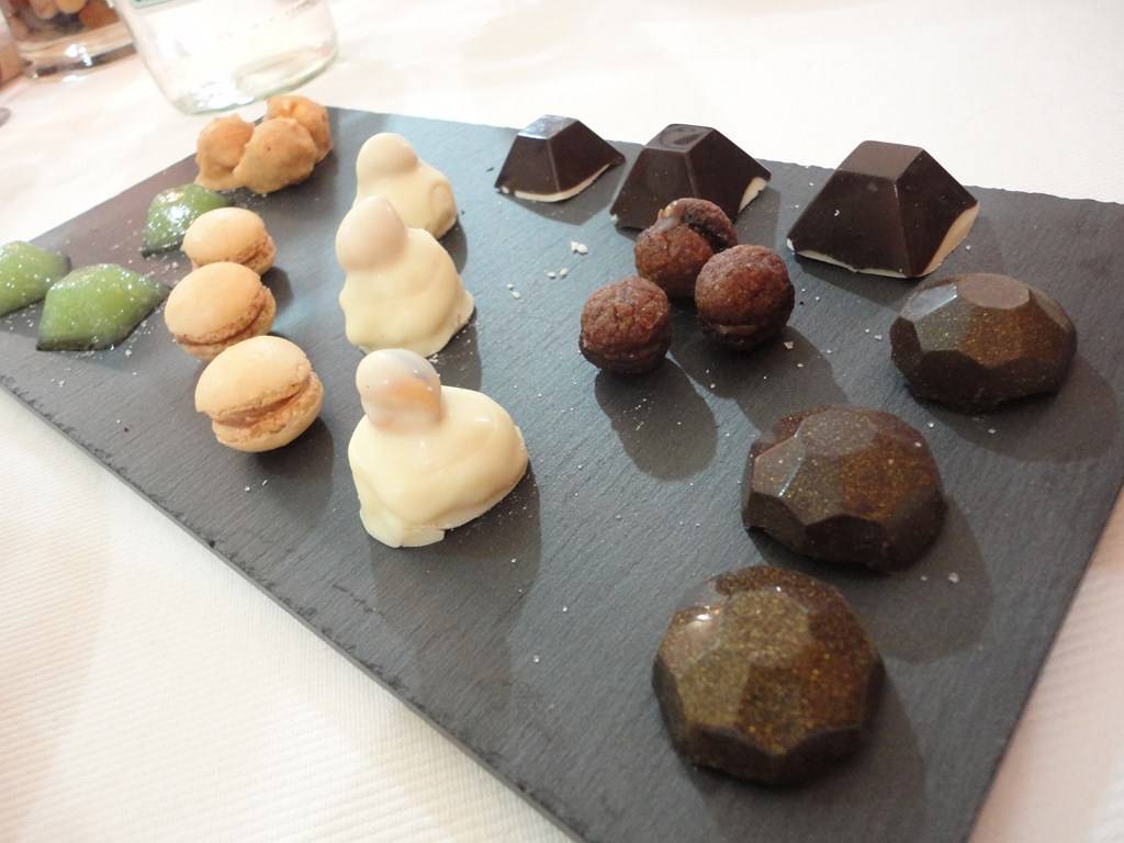 E poi la piccola pasticceria : cioccolotti sale e vaniglia, olio evo e limone candito, macaron all’italiana, gelatina di mela, bacio speziato al tabacco di sigaro, pop corn e cioccolato caramellato, cocco e nocciola.