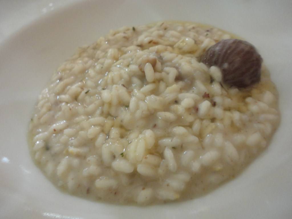 Il risotto castagne secche, confettura di limone e rosmarino (chef Giovanni Arvonio): l’idea di fondo è quella di creare un piatto che avesse per ingredienti prodotti del territorio reperibili tutto l’anno, e che quindi non fossero perticolarmente costosi. Il gioco delle contrapposizioni vede l’acidità della confettura di limone ad arginare la tendenza dolce sia del riso che della castagna,