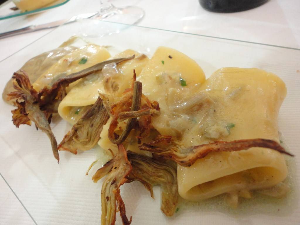 Piatto povero ma molto gustoso, a mio avviso da calibrare meglio l’acidità della confettura, un filino soverchiante rispetto a tutta la preparazione. Ancora il Faius in abbinamento. Si prosegue con Paccheri di Gragnano ai carciofi arrostiti (Giovanni Arvonio).