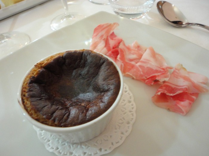 Ma passiamo ai piatti: si inizia già dal territorio. L’entreè è una “Polpettina di musetto di maiale su crema di patate”. Bel giochino di consistenze con il musetto della tradizione in evidenza sul resto.
