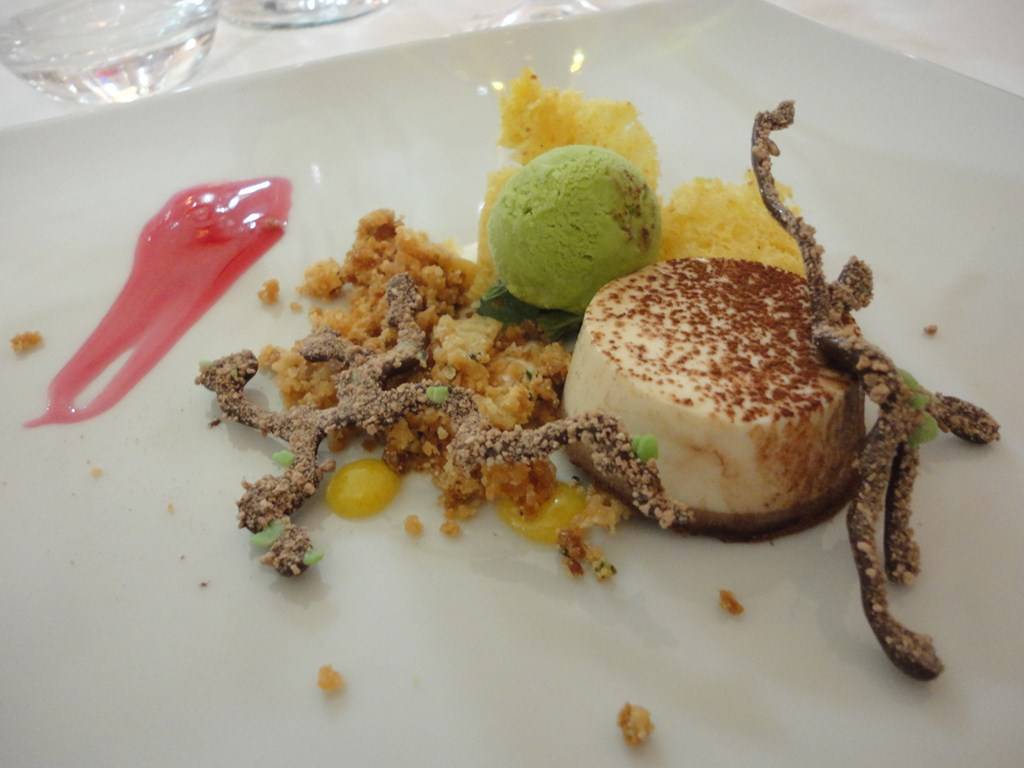 2) Sfumature di colline dalla costiera (gelato al basilico, panna cotta e spugna alla nocciola, streusel al basilico e salsa d’arancia).