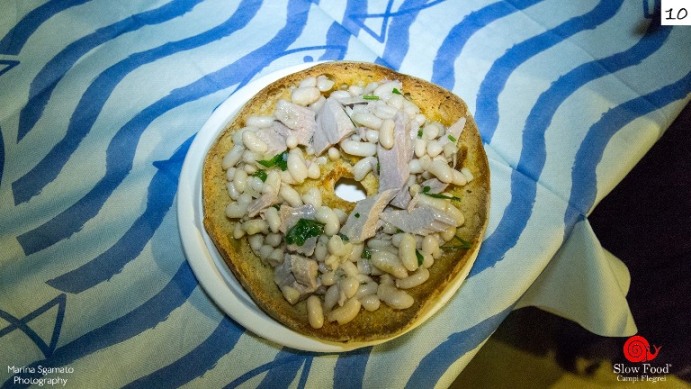 9- de “A Ridosso” di Giggino Palumbo è bagnata nell’acqua di cottura dei fagioli cannellini flegrei. Sopra, insieme ai fagioli, pomodoro cannellino, basilico, anelli di cipolla rossa e un delicato tonno sott’olio, preparato per l’occasione dallo stesso Giggino. In abbinamento, i vini di Masseria del Borro.