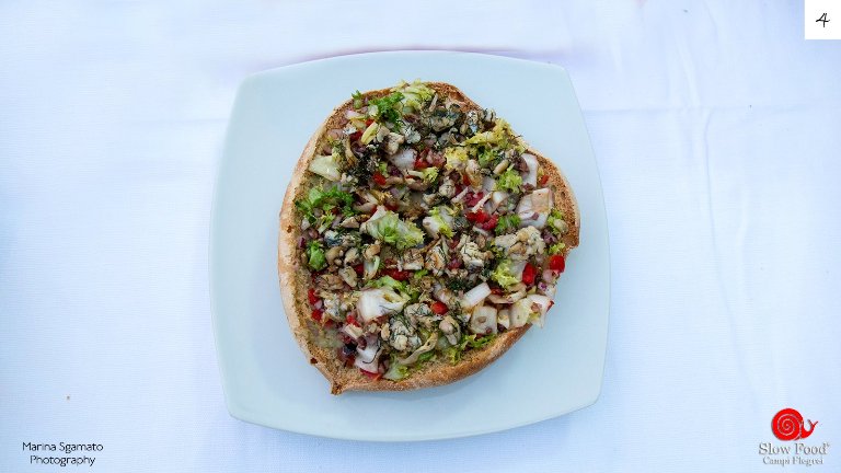 4- fatta dall’Osteria “Da Caliendo” di Francesco Di Fraia ha alla base una vellutata di cicerchia flegrea, legume autoctono, i cui semi sono custoditi da Luigi Di Meo. Su tale base, è posta insalata riccia e pomodorino cannellino, con bocconcini di sgombro appena scottati in padella. Coriandoli verdi di foglie di finocchietto selvatico, proveniente dalla zona dei “Pozzolani”, danno al tutto movimento. Ad accompagnare il piatto, falanghina e piedirosso di Cantine La Sibilla, vitigni autoctoni presentati da Vincenzo Di Meo.
