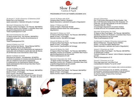 Siamo Slow Food Napoli e ci occupiamo di diffondere la cultura e l’informazione sul CIBO BUONO, PULITO e GIUSTO. Dentro queste tre parole ci sono talmente tanti significati ed informazioni importanti sul cibo che mangiamo tutti i giorni che per spiegarli ogni anno ci sforziamo di organizzare una serie di eventi in molte locations della città. Il programma di attività di Slow Food Napoli fino a dicembre 2015 è un calendario fitto di appuntamenti localizzati sia nel nostro spazio di Via Tribunali ‘O Vascio di Slow Food NApoli che in altre sedi sparse in Città e d in Provincia di Napoli.