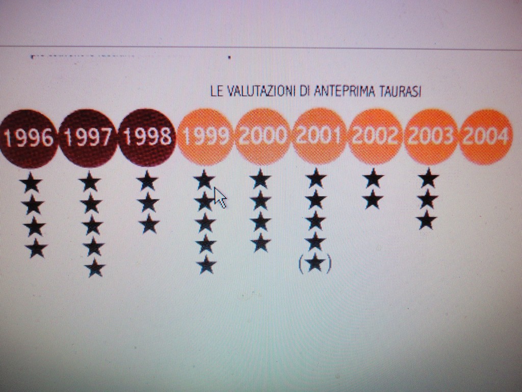Becchiamo tre annate su quattro, di quelle a 5 stelle, e cioè la 1999, la 2001 e la 2004. Per l’annata 2006, che pure era in degustazione, mi sembra che al momento non ci sia valutazione da parte della commissione, perchè la relativa Anteprima Taurasi, non ha avuto luogo. A proposito di stelle e giudizi, vorrei fare qualche riflessione dopo, alla fine del post. Giusto per inquadrare la zona, siamo sulla collina immediatamente di fronte al versante di Taurasi che guarda Montemiletto e Torre le Nocelle, appunto. L’areale è di quelli più tendenti verso la prontezza che verso la potenza e la muscolosità, vini quindi gratificanti nella beva già dopo i prescritti tre anni del disciplinare, figuriamoci poi dopo una decina di anni che annoverano i più “aged” della batteria!!!