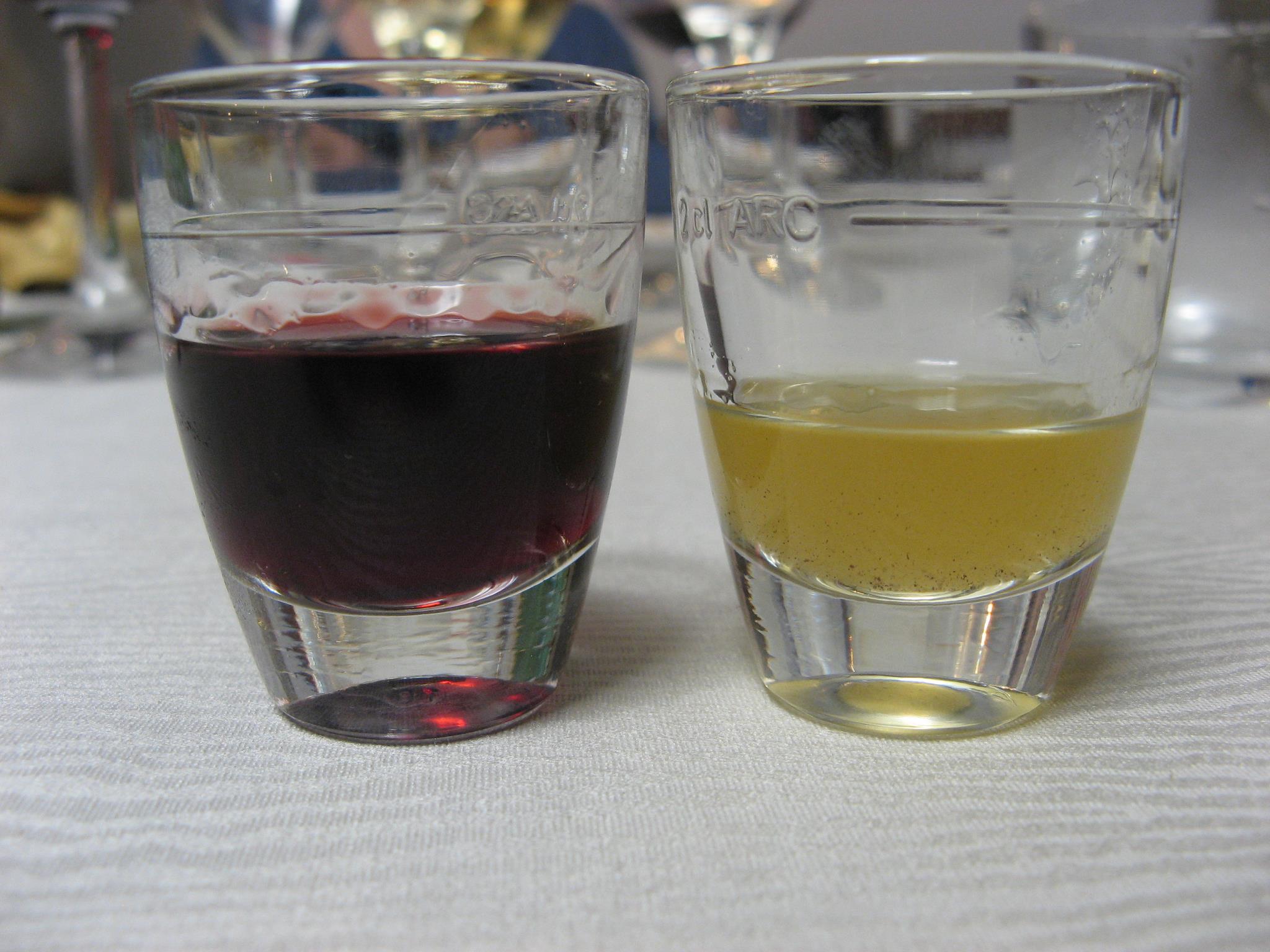 Concludiamo con le prugne al mosto cotto accompagnate dal rosolio di sciroppo di vino rosso e noccioli di amarena e dal digestivo del brigante.
