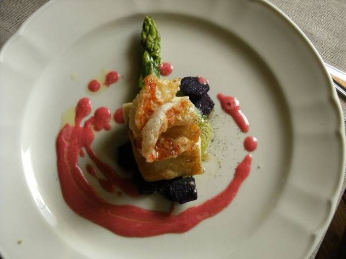 Ecco la pietanza successiva: Ravioli di patate violette affumicate in crema di zafferano e pescatrice. Un piatto giocato sulle consistenze, tipicamente nordico e supportato da un’ottima tecnica. Il vino è sempre il Greco.