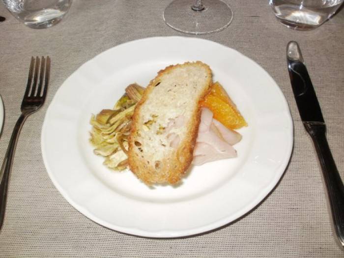 E allora eccoci pronti a provare i piatti di questo intrigante ristorante. L’entrée si materializza in un’insalata di carciofi crudi con pesce spada affumicato, agrumi e fetta di pane leggermente tostata.