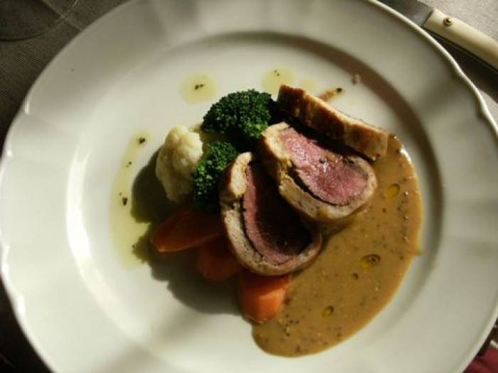 Piatto ben centrato e sapientemente modulato per la felicità del palato. Io continuo imperterrito a preferire il Greco, embè…”Proviamo un po’ di carne, ti va?”, chiede il mio amico commensale. E carne sia allora: Lombetto di agnello in farcia con i colori dell’orto.