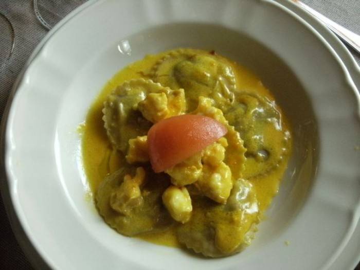 Ristorante Corte Visconti, Ravioli di patate violette affumicate in crema di zafferano con pescatrice