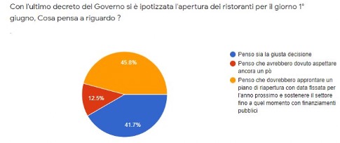 APRIRE L’1 GIUGNO è GIUSTO? Per il 45,8% servirebbe un piano di riapertura con data fissata al prossimo anno, con finanziamenti pubblici di sostegno”. C’è invece un 41, 7% più ottimista che ha voglia di verificare se vi sono condizioni effettive per ripartire.