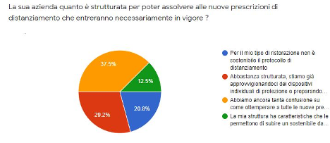L’AZIENDA PUO’ ATTUARE IL DISTANZIAMENTO? Anche qui due blocchi quasi contrapposti. Il 29,2 % ha già procurato i DIP e sta formando lo staff. Un su 8 subirà un danno sostenibile dovuto alla riduzione dei posti a sedere (12,5%). Un 37,5% teme soprattutto le disposizioni “sottintese” quindi non espressamente indicate nei provvedimenti legislativi. Molto delicata la situazione di chi (1 su 5) dichiara che il protocollo di distanziamento non è sostenibile con il tipo di ristorazione offerta.