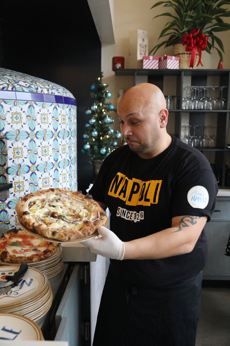 “La mia è una pizza classica napoletana, che rispetta le caratteristiche di un impasto leggero, ma intenso, con un cornicione non molto alto e davvero soffice”, precisa il pizzaiolo napoletano. Il forno di Song’ E Napule è rigorosamente a legna, campano e artigianale e arriva dall’azienda Gianni Acunto Forni Srl.