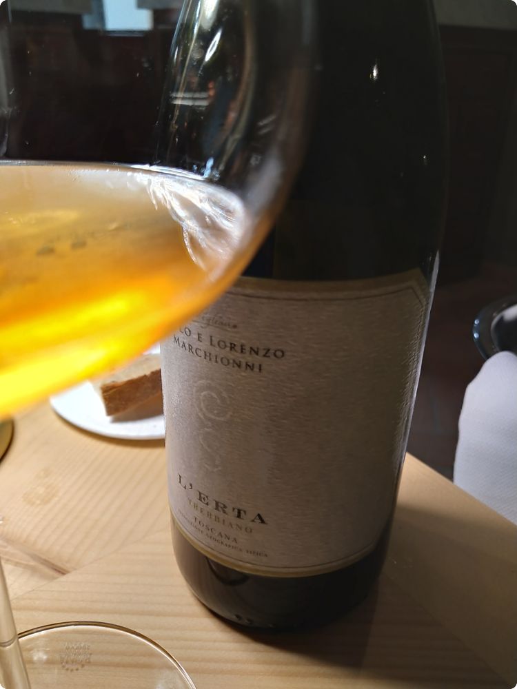 La carta dei vini pesca solo ed esclusivamente dalla Toscana: scelta coraggiosa del sommelier Lorenzo Caponi (lo champagne: si beve in Francia!) ma oculata, è possibile scegliere tra un bel numero di etichette interessanti e correttamente prezzate; la mia scelta è caduta su un bianco del territorio del Chianti Colli Fiorentini ovvero il Trebbiano IGT “L’Erta” di Paolo e Lorenzo Marchionni che si è comportato molto bene anche in abbinamento al mio menù carne.