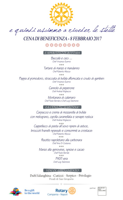 Il Rotary e l’Unicef esprimono la loro profonda gratitudine nei confronti della “Feudi di San Gregorio S.p.A.”, generoso partner dell’iniziativa, i cui vini saranno abbinati al prestigioso menù che spazierà dall’astice al manzo.
