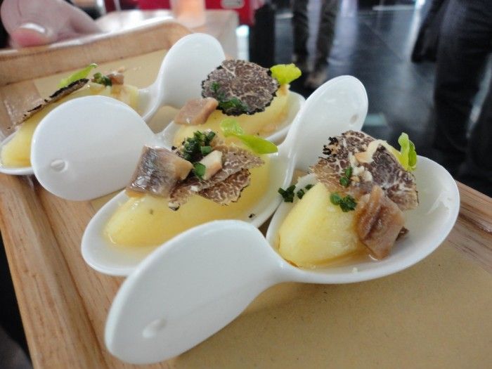 Intanto, nella gara delle piacevolezze, si materializza Paolo Barrale, siciliano di nascita, ma ormai più irpino dei lupi … è in Irpinia dalla scuola di Heinz Beck Ci delizia con una amouse bouche su un cucchiaio contenente schiacciata di patate con olio di nocciola mortarella, alice di Cetara (frutto del ripopolamento effettuato nel fiume Calore da Pasquale Torrente) e tartufo di Bagnoli.
