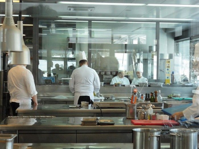 Cucina a vista, separata dalla sala solo da un’enorme vetrata, dietro alla quale intravediamo un’operosità ordinata nella quale si confonde anche qualche tratto somatico orientale.