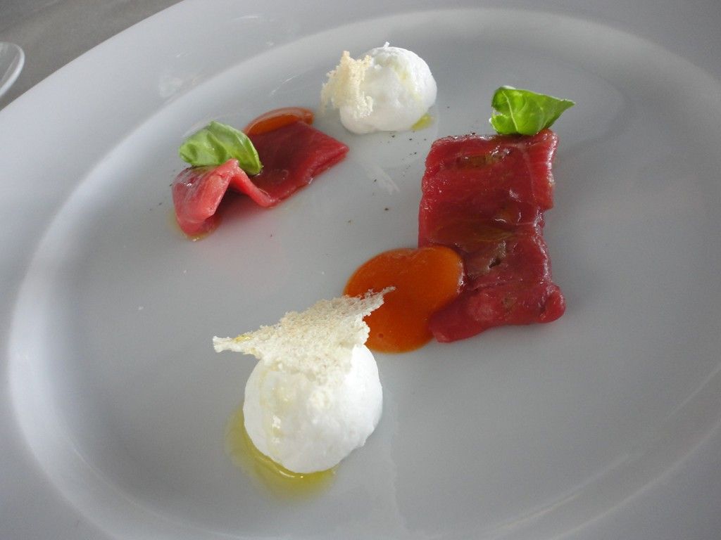 In successione, è la volta de “La mia pizzaiola”. Si tratta di carpaccio di scottona, melanzane affumicate (ecco la Sicilia), pomodoro e mozzarella di bufala.
