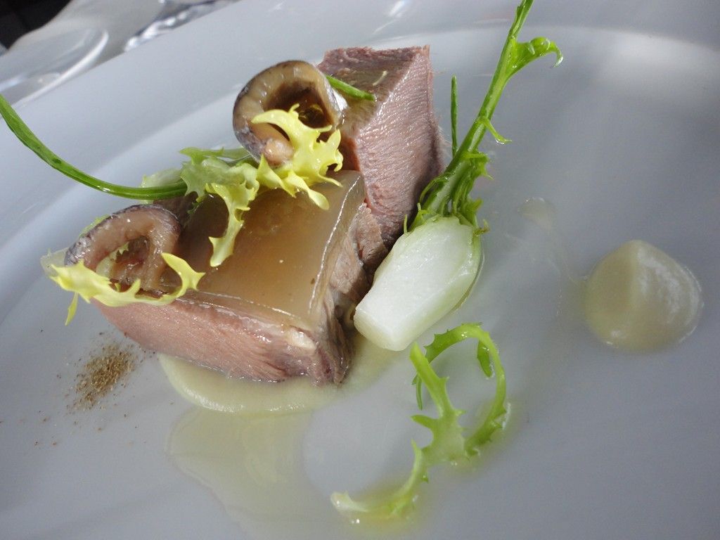 Che cos’è la scottona? Si tratta di vitella giovane (15/18 mesi) mai gravida e per questa incapacità macellata anzitempo. Da qui l’appellativo, per il contadino “scottato” dal problema. La sua carne è resa tenerissima e saporitissima dalle infiltrazioni di grasso (marezzature) tra le fibre magre, dovute alla sua particolare condizione. Secondo “appetizer”: musetto di vitello, purea d’aglio dolce dell’Ufita, insalata di puntarelle e alici di Cetara.