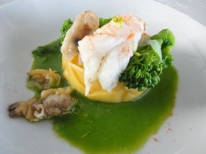 E qui siamo nel pieno della tradizione in Campania ( o’ per e o’ musso) e nel Lazio (le puntarelle), anche se non è chiaro se le puntarelle siano proprio di origini laziali. Infatti, sembra che qualcuno faccia risalire la coltivazione di questa verdura, che poi non è altro che una varietà di cicoria, sulle sponde del fiume Sabato, alle falde di Montefredane…ma approfondiremo sicuramente in altra occasione, Antonio Scuteri e Virginia Di Falco…ritenetevi avvertiti!!! E siamo ai primi… “Raviolo di burrata, crudo e cotto di frutti di mare crudi e cime di rapa “.