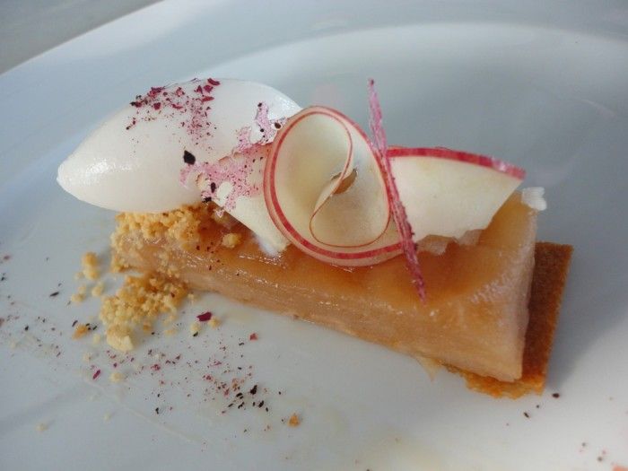 Antonio fa passo, io e Luciano no ! ” Tatin di mela annurca, gelato al latte di rosa canina e tisana al Karkadè”. La torta Tatin, si…quella che prende il nome dalle famose sorelle omonime, le quali incidentalmente, realizzarono una crostata capovolta per aver dimenticato di preparare la pasta frolla di base. Semplicemente deliziosa, abbinata al Privilegio 2010 da Fiano passito… di soli 12°, struttura e piacevolezza notevoli…