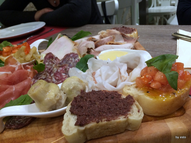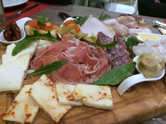 Il tagliere con la scelta dei salumi e dei formaggi è vistosamente ghiotto.