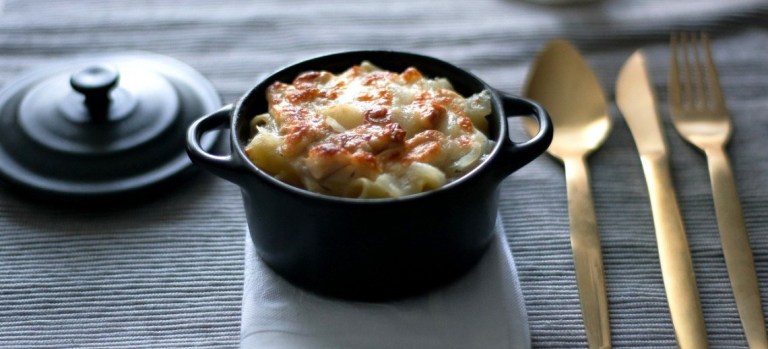 In una cocotte, distribuire strati di crema di cipolla, pasta, mozzarella. Terminare con la mozzarella affumicata e mettere sotto il grill dai tre ai cinque minuti.
