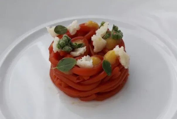 In un pentolino versare 200 ml di salsa di pomodoro rosso. Portare a 90 °C aggiungendo 2 g di agar agar ed amalgamare il tutto. Dopodiché con una siringa collocare il composto in un astuccio di gomma di una lunghezza di 30 cm. Lasciare raffreddare in acqua con ghiaccio fino a farlo solidificare. Soffiare nell’astuccio facendo venire fuori i filamenti; e ripetere l’operazione fino a raggiungere la quantità desiderata facendo attenzione che il composto preparato rimanga sempre a temperatura per non far formare grumi.