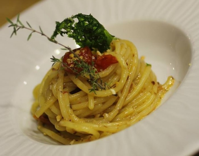 Spaghetti con nocciole del Vesuvio e pomodorini del piennolo del Vesuvio confit – foto di Mariana Silvana Dedu