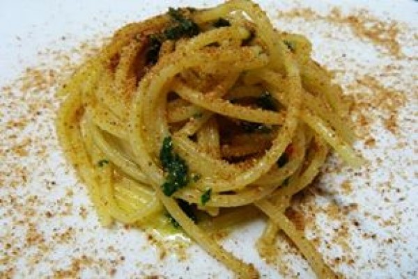 in un'altra padella tostare e bruciacchiare del pane grattato - a questo punto, raggiunti i 5 minuti di cottura degli spaghetti, scolarli bene e versarli nella padella del soffritto