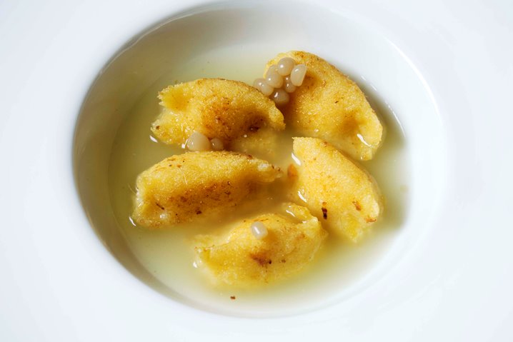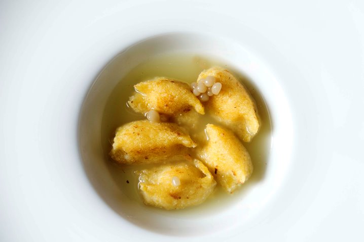 Sul fondo del piatto mettere qualche cucchiaio di essenza di bufala e salvia, aggiungere cinque ravioli per porzione e completare con le perle di acciughe.
