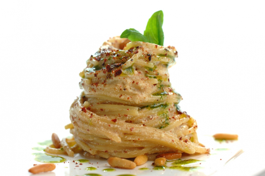Spaghetti con ricotta di bufala, briciole di pomodoro, olio al basilico e pinoli tostati piccanti