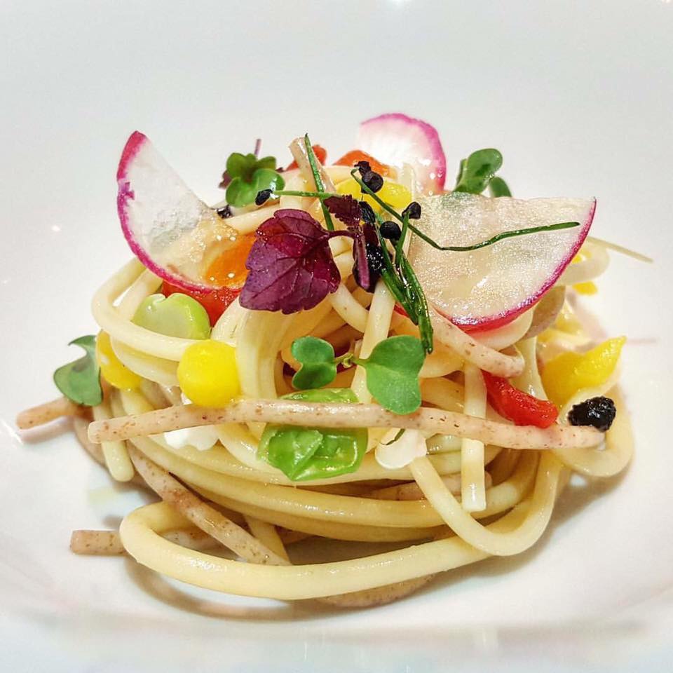 Lo spaghetto 3.0 uno spaghetto freddo con 4 tipologie di pasta lunga Monograno Felicetti: Spaghettone Matt, Spaghetti Kamut, Spaghetti di Farro e Spaghetti II Valentino (Senatore Cappelli) massaggiati in olio evo con cremoso di aglio nero, crudo di fave e ravanelli, pomodoro San Marzano DOP al thè verde, maionese di mango e spuma di bufala.