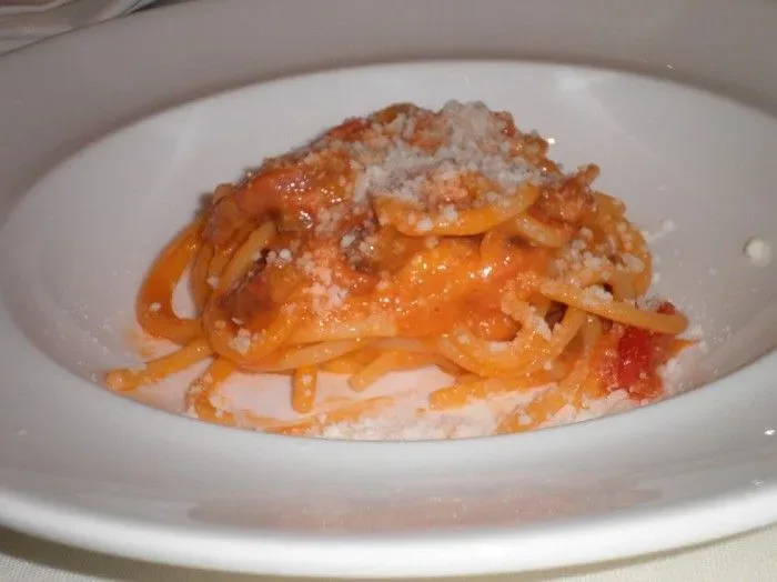 Spaghettone con pomodoro del piennolo, guanciale e pecorino