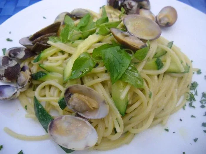 Spaghettoni di Gragnano con vongole e menta 11/10/2012 Torna a: Spaghettoni di Gragnano alle vongole con zucchine e menta Gli spaghettoni alle vongole del ristorante “Capricci” di Anacapri