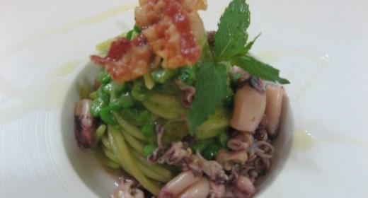 Spaghettoni di Gragnano con calamari, piselli e mentuccia