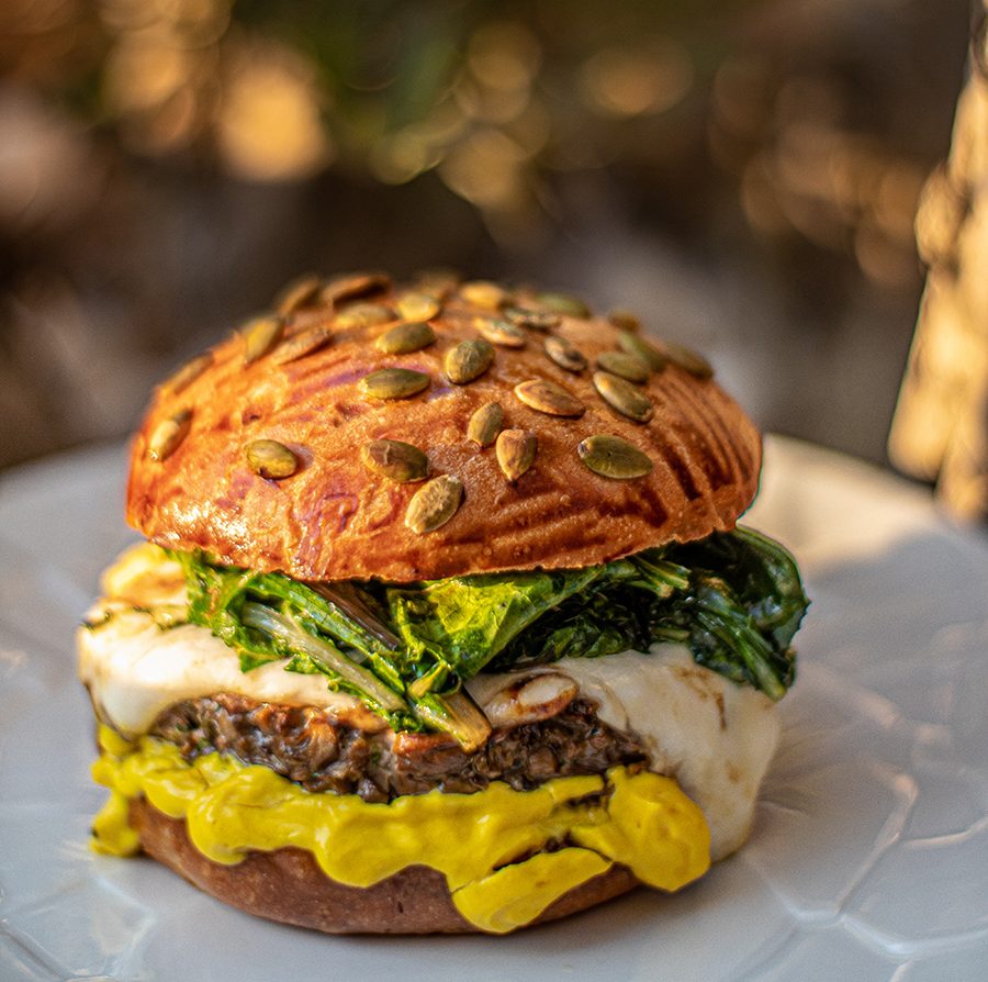 Questo panino nasce dall’idea di voler trasformare i funghi champignon in hamburger, senza trascurare la texture originale che presenta quello di carne. Il finto hamburger è accompagnato da maionese con olio allo zafferano, provola e bietola, il tutto racchiuso in un bun artigianale con semi di zucca.