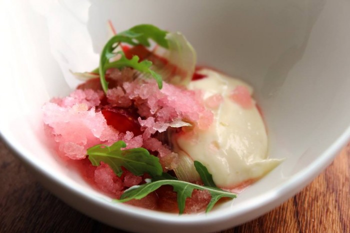 Gioco di abbinamento tutto a crudo, la vinagrette al pistacchio dona sapore, le ciliegie forniscono il contrasto necessario per la riuscita del piatto.