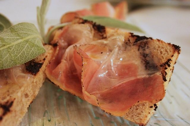 Sulla bruschetta di pane cafone una ventresca nordica trafilata e dal profumato grasso rosato.