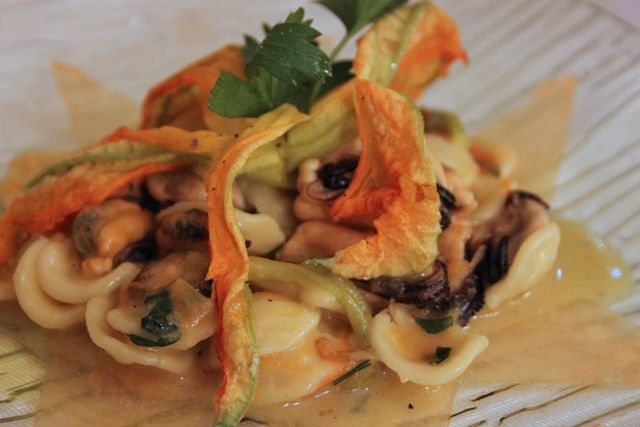 Le orecchiette, queste sì conterranee, riposano con i sciurilli e le cozze.