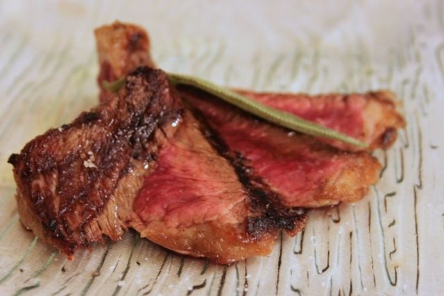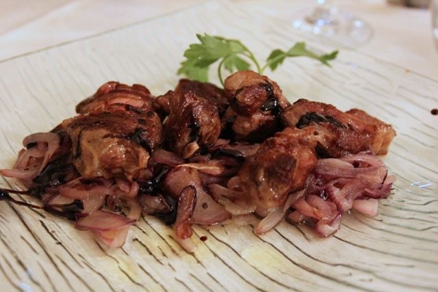 E perciò è umorosa e buona sia in Tagliata demi blue che in Bocconcini saltati in padella e poi riposti su letto di croccante cipolla tropeana inumidita con aceto balsamico modenese.