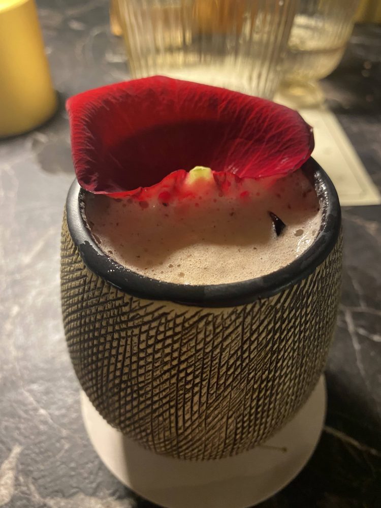 Roku gin, cordial composto da lime, timo, shiso e lemon grass e – a completare – il sake umeshu (si tratta di un sake nato dall’infuso dell’ume, una prugna tipica del luogo, nel sake Ginjo). Il colore rosa è dato dall’infusione con i fiori di ciliegio. Leggermente agrumato all’olfatto, in bocca si presenta molto fresco. Ma il viaggio non finisce qui. Il Sud America, ad esempio, è contemplato in più tappe: