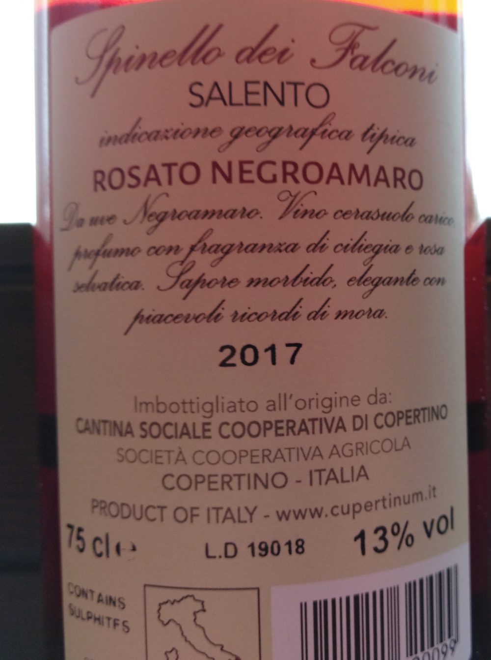 Ed allora ecco qui proprio un prototipo di un rosato pugliese-salentino che ho degustato in questi giorni: Spinello dei Falconi Rosato Negroamaro Salento Igt 2017 della Cantina Sociale Cupertinum di Copertino. Azienda sorta nel 1935 e che può contare su trecento soci conferitori che coltivano trecento e più ettari di vite, per un numero di bottiglie prodotte annualmente superiore al milione.
