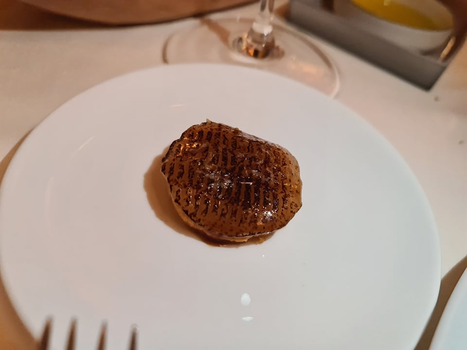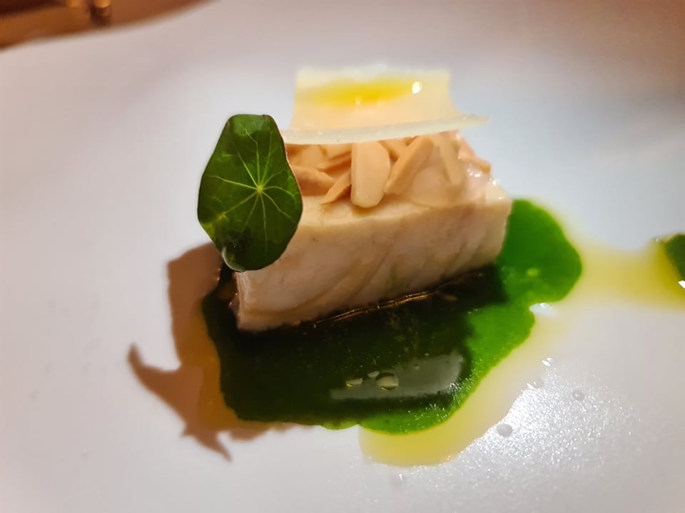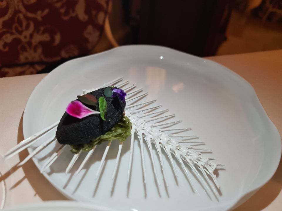 Dopo l’aperitivo le mie aspettative si sono decisamente alzate, non volevo solo fare una buona cena. L’avvio è stato spiazzante e senza fiato per i cinque piatti. Bouquet di erbe, shiso, sedum, un ingresso vegetale, molto intenso, verticale e pungente, mi ha ricordato l’essenzialità della cucina giapponese e dell’ossessiva ricerca di un gusto quanto più netto e pulito possibile. Poi le lumachine, pelle di salmerino alla mugnaia, dal gusto profondo di lago, con la consistenza callosa delle lumachine che facevano da contraltare alla consistenza della pelle di salmerino. Con l’insalata di trota salmonata emerge la tecnica sopraffina, il gusto per la bellezza, le influenze francesi e monsieur Gagnaire, meravigliosa. Il tonno, jus affumicato è l’incrocio tra la cultura del Giappone e la ricerca spasmodica dell’umami e la tradizione sauciere della cucina francese, in una chiave anche qui, assolutamente personale.