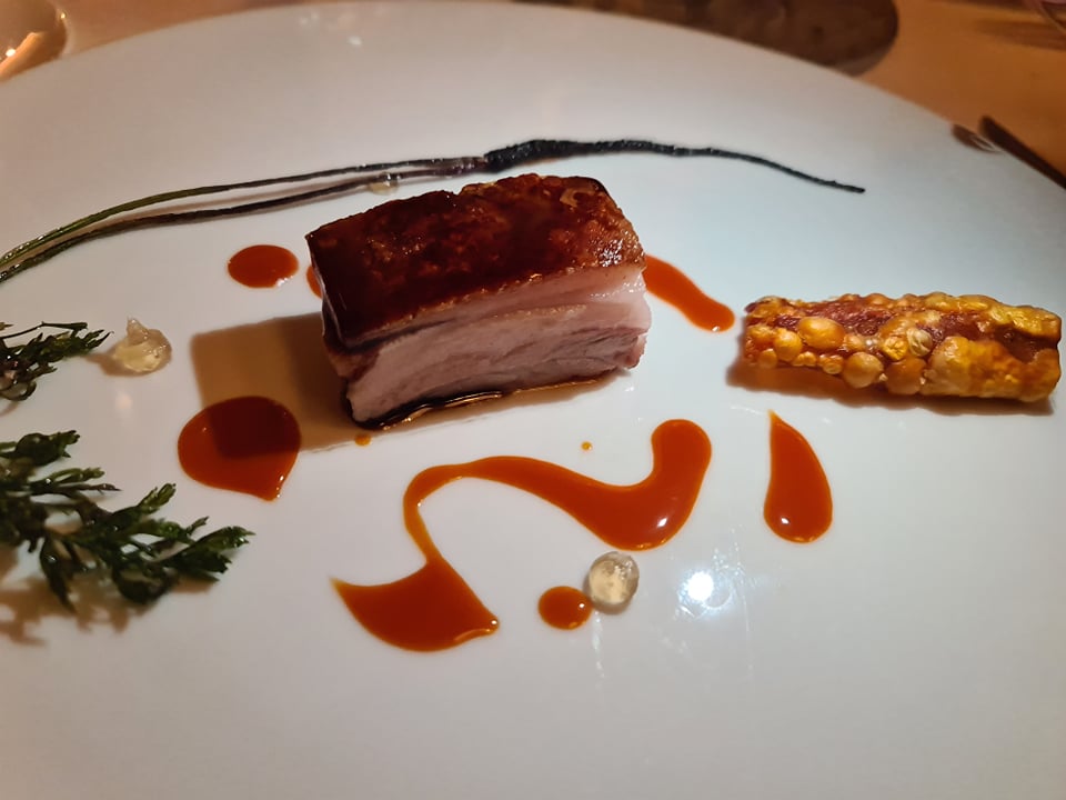 Branzino, agrumi, nasturzio e il rombo, fragoline, “barba” alla diavola, sono la dimostrazione che il mondo vegetale per lo chef marchigiano è il tema vero della sua cucina. Le cotture dei pesci sono millimetriche, le salse a regola d’arte, ma il tocco vegetale è la vera svolta dei piatti, c’è, si sente e diventa oltre che il leitmotiv di questa cucina, il cambio di passo decisivo nelle sensazioni gusto olfattive. La cinta senese, cotenna, pestöm è di grande scuola, goloso, chiude la parte salata con una concessione alla gola e alla pancia.