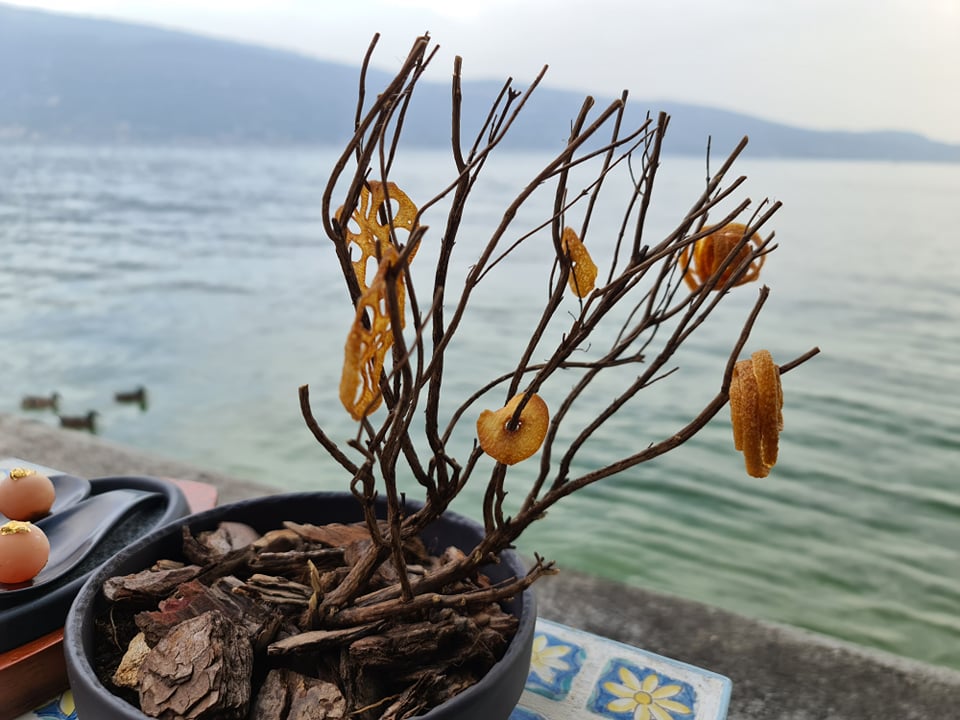 Lo scenario per l’aperitivo era davvero incantato, la Villa, il Lago, lo splendido parco, un momento di assoluta bellezza, che sicuramente cattura l’attenzione e spesso quando capita di immergersi in luoghi così meravigliosi, la cucina e soprattutto l’aperitivo passa in secondo piano. Nel mio caso è successo l’esatto opposto. Man mano che arrivano le preparazioni, la mia attenzione era catturata sempre di più da quello che mangiavo e non dalle meraviglie che mi circondavano. Chips di fiori di loto, la piadina vegetale (sedano rapa), gli spaghetti di piselli, la fantastica tartelletta di carote, il sorprendente royale di cerfoglio, la bolla al campari di bulliana memoria.
