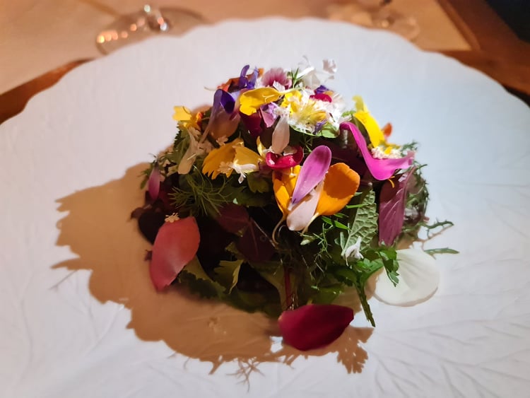 Circa 140 tra erbe e fiori, una semplice insalata è il vero “signature“di Stefano Baiocco, in carta da una decina d’anni all’incirca. Democratica e anarchica. Democratica perché c’è solo una tipologia per specie vegetale. Anarchica perché in bocca fa come le pare. Per fare un paragone con l’insalata di Crippa, (sono senza dubbio le due insalate più famose d’Italia), quella dello chef di Piazza Duomo ad Alba ha più una sensazione di controllo, lo chef ti porta in un punto preciso, quella di Baiocco invece racconta la forza la bellezza del mondo vegetale senza controllo e senza freni. Due grandi piatti serviti in due momenti diversi, infatti Baiocco la serve al posto di un ipotetico sorbetto per resettare il palato.