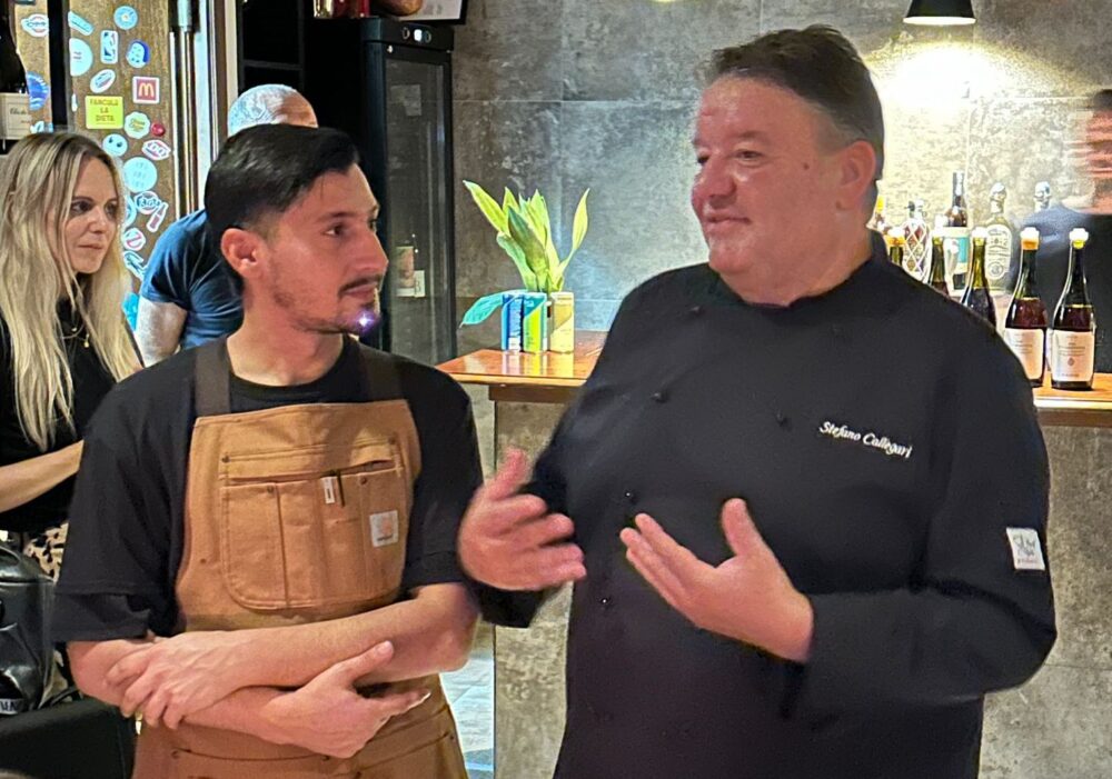 Stefano Callegari per una sera a Napoli. Salito sul podio della guida 50 Top Italy (terzo classificato Migliore street food 2025 – Il Fritturista Oleificio Zucchi Award), l’inventore della celebre scarpetta da asporto, il Trapizzino, è stato protagonista della cena a quattro mani con Leopoldo Di Martino, chef resident di Jus Enoteca Naturale in via Bausan. Il pluripremiato chef romano ha spiegato che voleva “creare un abbraccio tra tradizione e il contesto odierno di Jus. Ho visto in Leopoldo l’interlocutore ideale”. La cucina antica, quella dei sapori semplici di una volta, fatta di lente preparazioni e “comfort food” è stata infatti al centro della serata che ha unito due città, due modi diversi di interpretare materie prime e accostamenti.