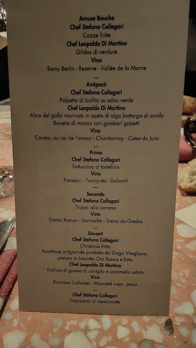 E poi il Trapizzino di mezzanotte. Sull’altra corsia i piatti di Di Martino: Gildas di verdure, Alice del golfo marinata in aceto d’alga, bottarga di scrofa e bavetta di manzo con gamberi gobetti, frollino di grasso di coniglio e caramello salato.