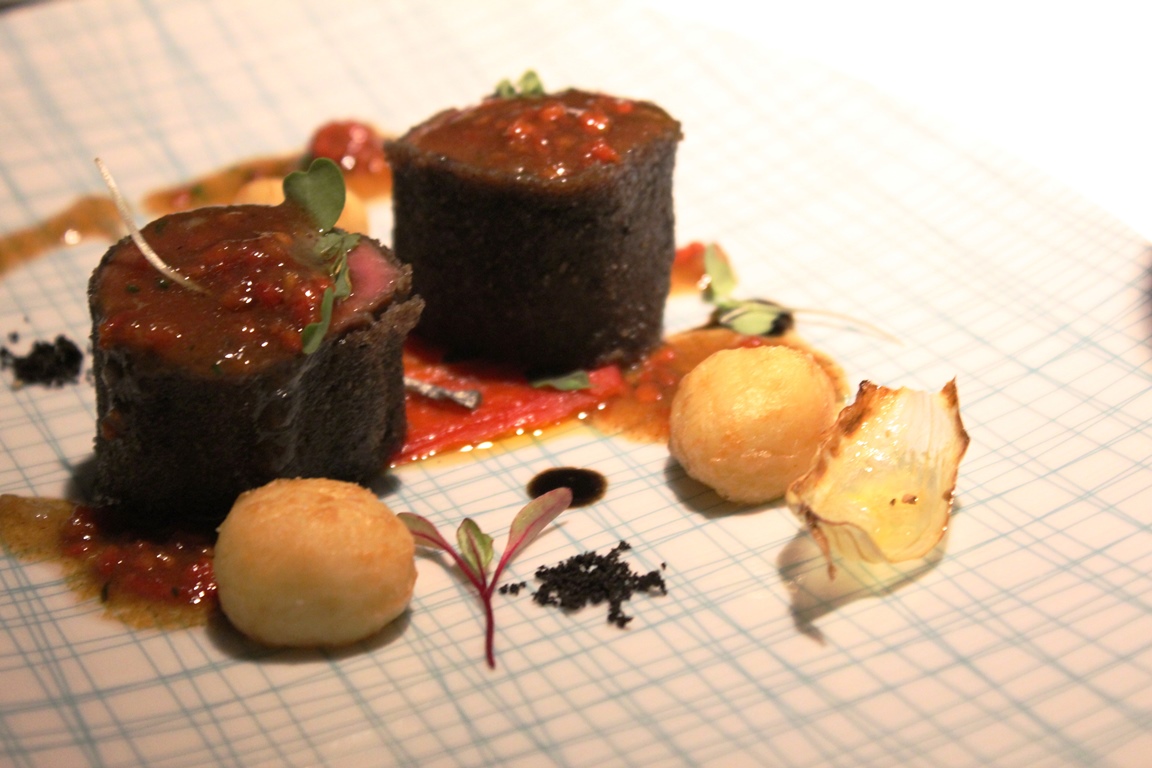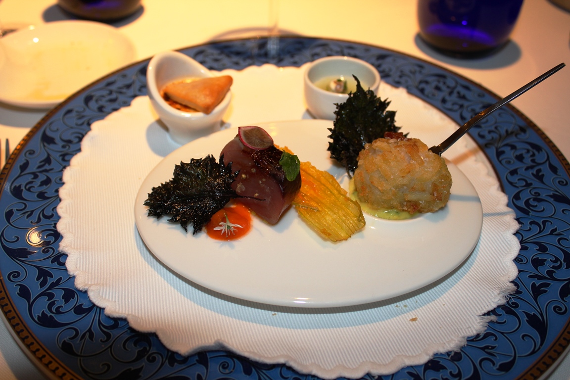 - Rossini di tonno al sesamo tostato, foie-gras, tartufi di mare, ciliegia ed albicocca
